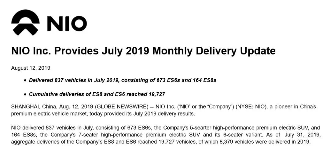 翻开百度一搜,蔚来 2019 年 7 月的销量是 1502 辆,包含 1066 辆 ES6 和 436 辆 ES8。但是 8 月 12 日,蔚来自己发布了 2019 年 7 月的销量,蔚来共交给 837 辆,包含 673 辆 ES6 和 164 辆 ES8。第三个信源显现,7 月蔚来 ES6 销量为 660 辆,ES8 销量为 153 辆。这是怎样回事?
