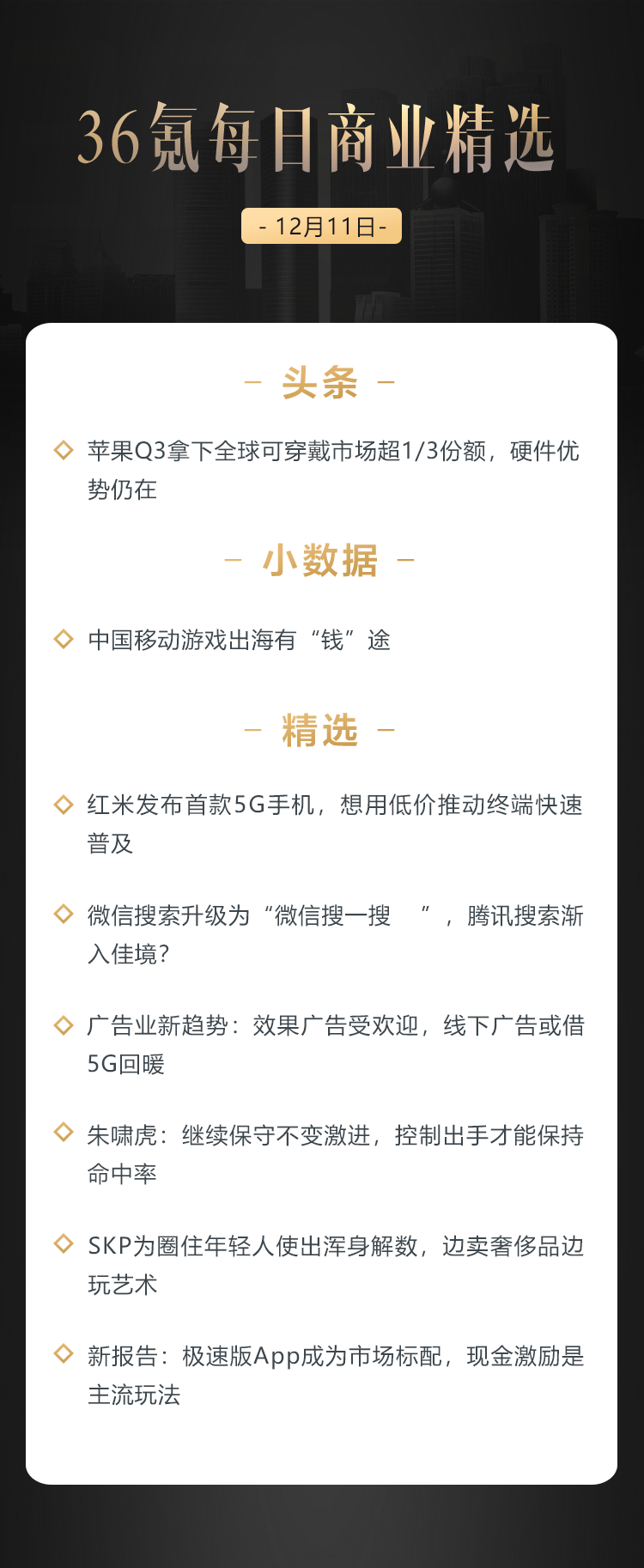 本文来自36氪付费栏目《36氪每日商业精选》——12月11日