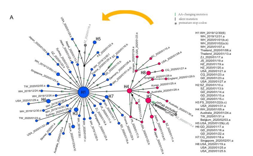 研讨人员根据病毒 RNA 基因组的第 28144 位点将这些基因组数据分为 2 个组,L 亚型是 T 碱基(对应亮氨酸,Leu),S 亚型是 C 碱基(对应丝氨酸,Ser)。并得出 S 亚型新冠病毒与蝙蝠来历的冠状病毒在进化树上更挨近,即 S 亚型相对更陈旧的定论。