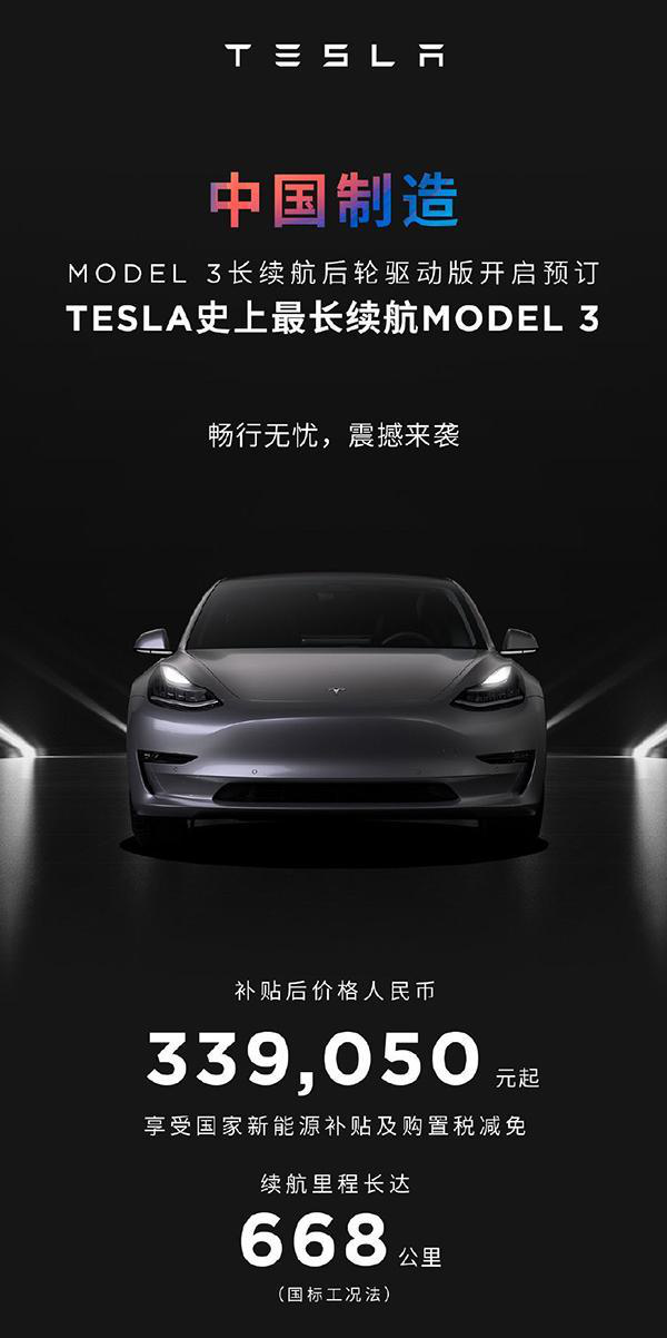 据了解,我国制作Model 3长续航后轮驱动版续航路程达668公里,是特斯拉史上最长续航Model 3,补助后价格为人民币339,050元起。而我国制作Model 3高性能全轮驱动版,起价格为419,800元。至此,特斯拉Model 3全系在售车型敞开我国制作。
