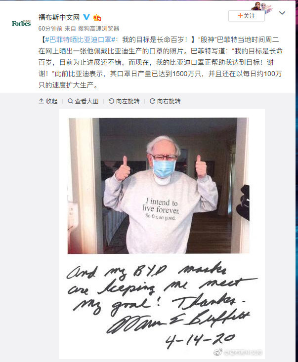 巴菲特写道:“我的方针是天保九如,目前为止发展还不错。而现在,我的比亚迪口罩正帮助我到达方针!谢谢!”